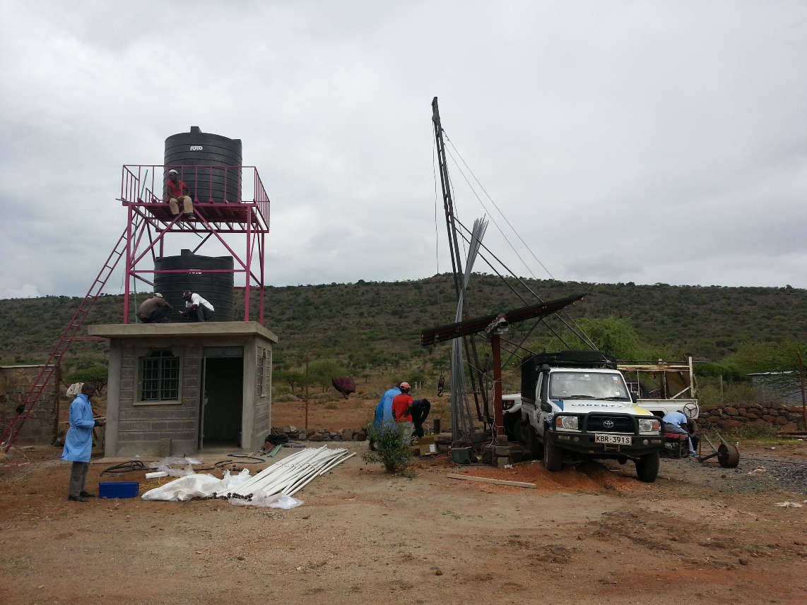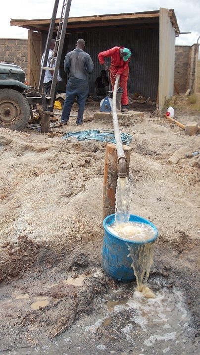 A drilling rig is required for the drilling. As the drill progresses into the ground, extra drill rods are added until eventually the drill reaches the required depth; 160m (500') in our case. We employed a geologist to supervise the drilling process; one of the best decisions we made. Once drilled, the bore-hole must be lined with steel casing to stop the bore-hole collapsing and to screen out the large sand particles from entering the pump. The casing is plain in the areas with no water and with fine slots in areas with water. The drillers were unable to force the casing into the bore-hole because the bore-hole had not been drilled straight. They tried to pretend that all the casings were inserted but the supervisor found the casings hidden in the back of the lorry.